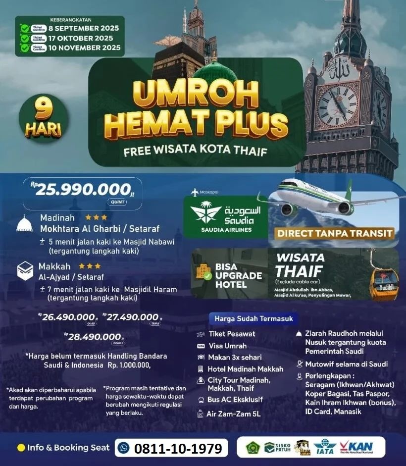 ➡️ Umroh Hemat Saudia Plus Thaif – Ibadah Tenang, Hati Senang, Kantong Aman!