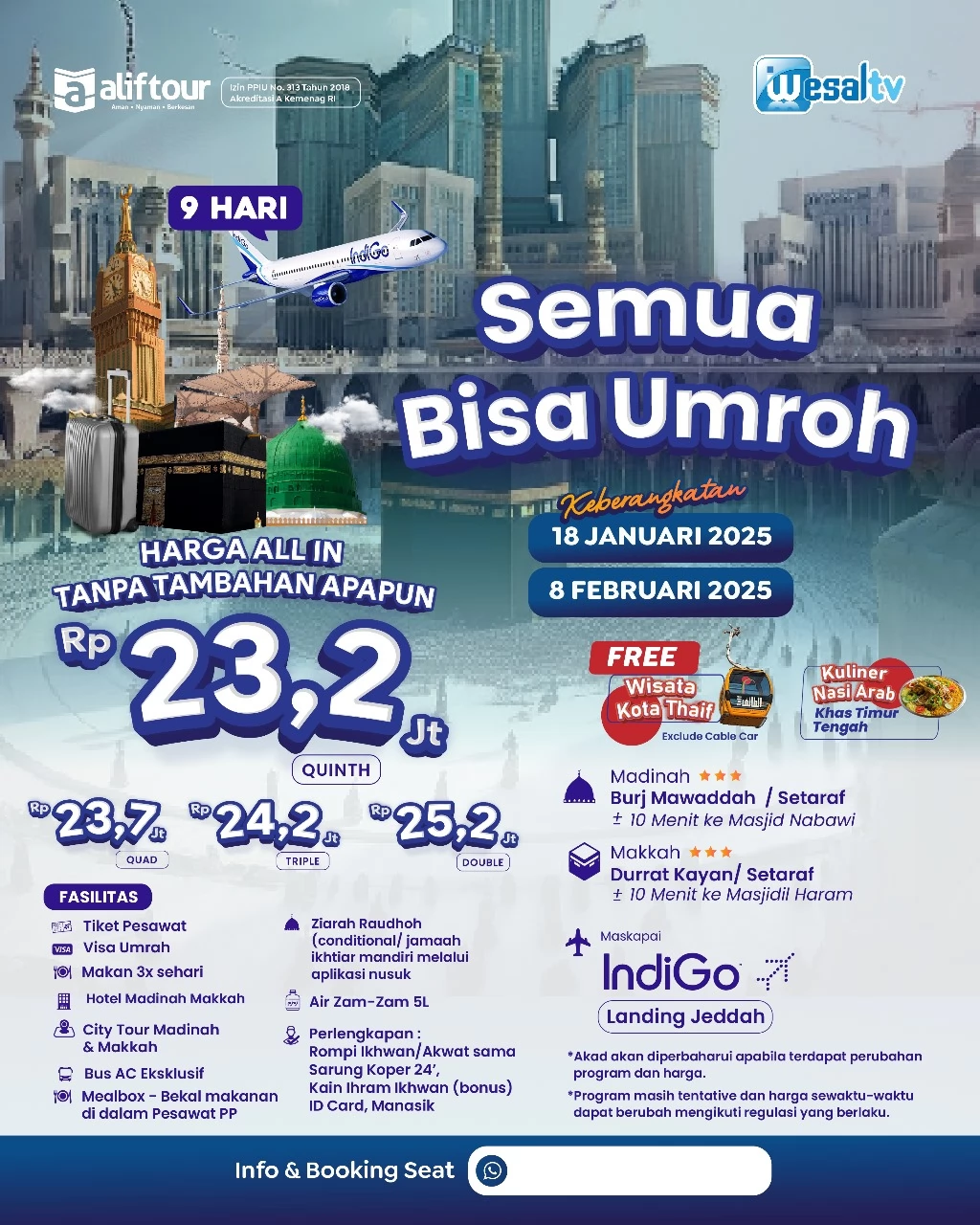 UMRAH  FULL RAMADHAN  KEBERANGKATAN   ESTIMASI  28 FEB - 31MAR 2025 فَإِذَا جَاءَ رَمَضَانُ فَاعْتَمِرِي ، فَإِنَّ عُمْرَةً فِيهِ تَعْدِلُ حَجَّةً مَعِي “Apabila datang bulan Ramadan, lakukanlah umrah, karena umrah di bulan Ramadhan senilai haji bersamaku.“ (HR. Bukhari ...