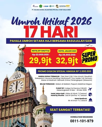 Ini adalah kesempatan terbaik untuk meraih pahala setara dengan haji! Jangan sampai ketinggalan. Daftar sekarang untuk Umroh I'tikaf 2026 dan nikmati perjalanan spiritual yang penuh berkah. Konsultasi segera melalui nomor kami dibawah ini untuk informasi lebih lanjut dan pendaftaran!