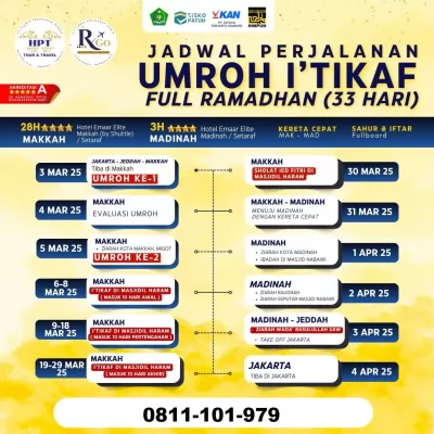 10 hari penuh di Tanah Suci, beribadah di Masjidil Haram dan Masjid Nabawi, di waktu terbaik sepanjang tahun—tengah Ramadhan—saat pahala dilipatgandakan.