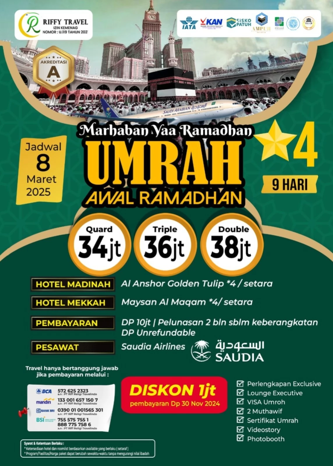 Apakah Anda siap menjalankan ibadah umrah di bulan Ramadhan yang penuh berkah? Jangan lewatkan kesempatan untuk mengikuti Paket Umroh Awal Ramadhan 2025 Jaminan Berangkat ini! Dapatkan fasilitas lengkap, bimbingan ustadz berpengalaman, dan kenyamanan dalam menjalankan ibadah di Tanah Suci. Hubungi agen perjalanan umrah terpercaya sekarang dan daftarkan diri Anda untuk meraih keberkahan di awal Ramadhan. Jangan tunggu lama, wujudkan niat suci Anda untuk beribadah dengan tenang di Tanah Suci bersama kami!
