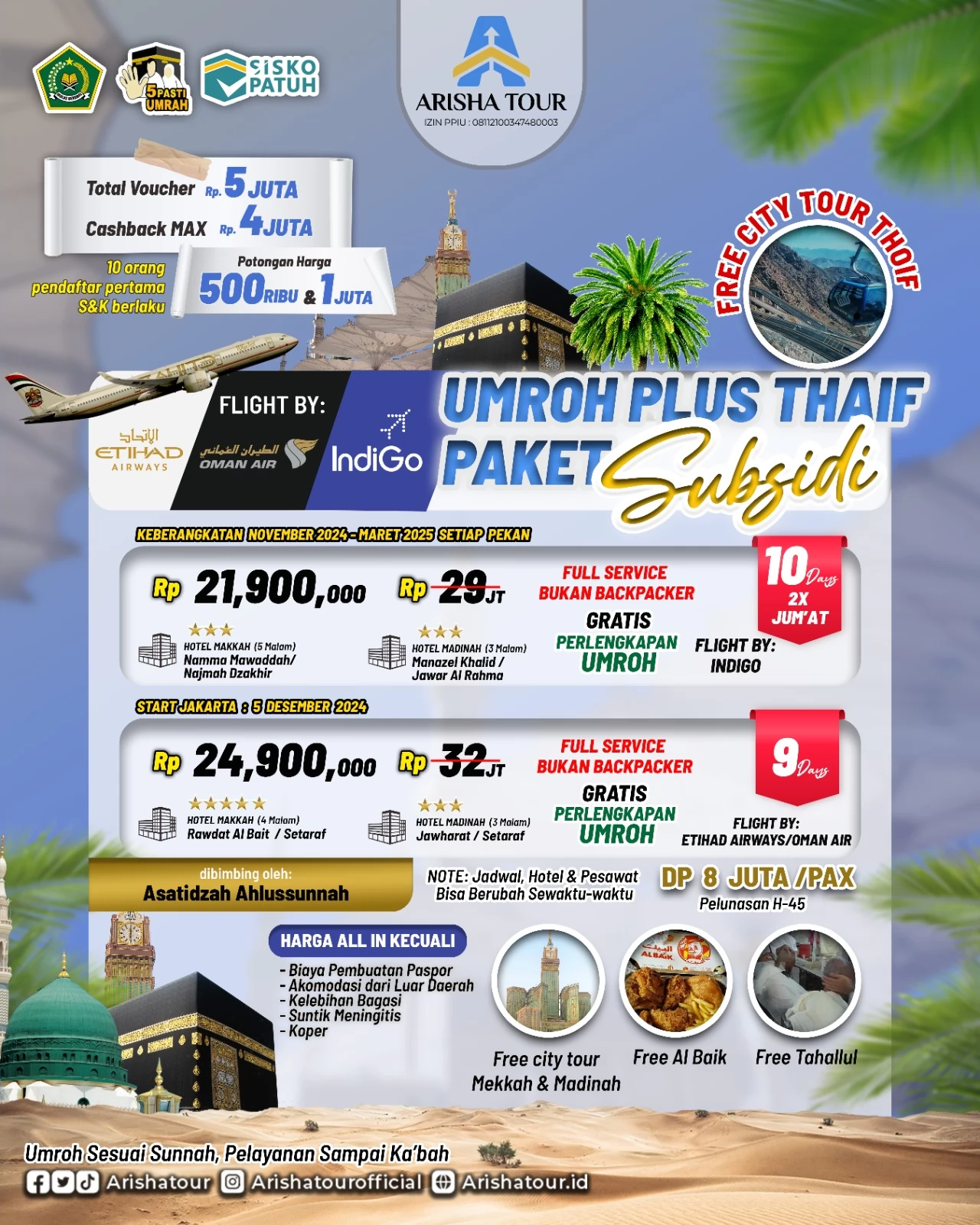 Paket Umrah Subsidi 10 Hari 2 Kali Jumat: Hanya 20 Jutaan, Wujudkan Impian Ibadah Anda Harga Normal UMROH SUBSIDI Rp. 29 JUTA Special Daftar booking/full payment tgl 11/11/24   Rp. 21.900.000,- Ibadah umrah kini semakin terjangkau ...