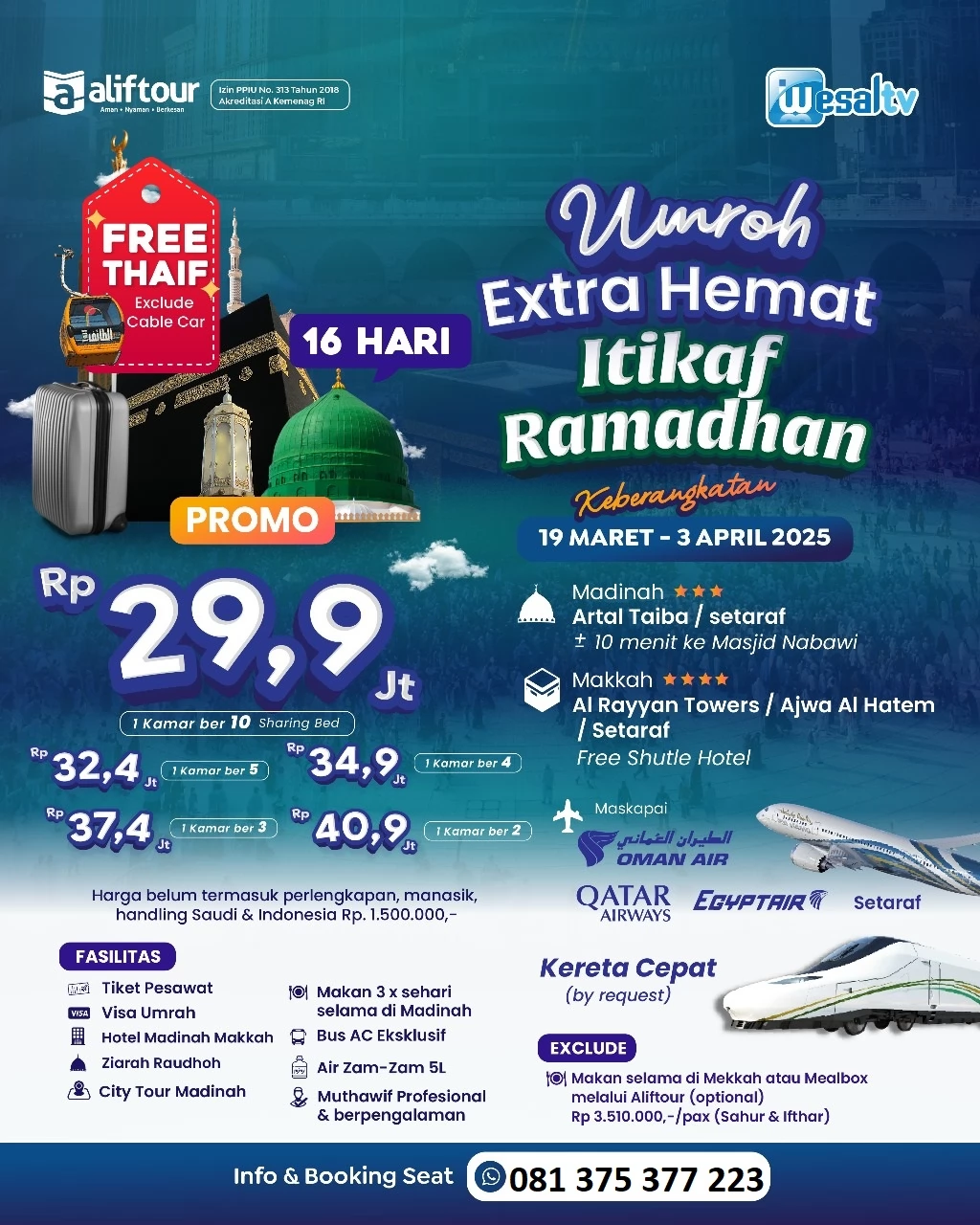 Dengan harga yang kompetitif, Anda bisa mendapatkan pengalaman spiritual luar biasa selama 16 hari, lengkap dengan berbagai fasilitas berkualitas.