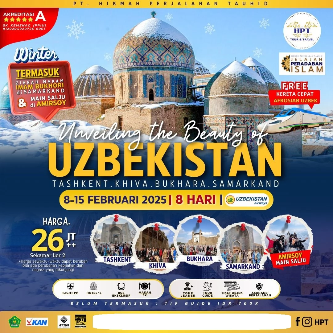 Segera daftar untuk Wisata Halal Uzbekistan di Musim Dingin pada 8-15 Februari 2025. Jangan lewatkan kesempatan emas ini untuk menikmati keindahan salju di Uzbekistan, menjelajahi situs-situs bersejarah, dan merasakan perjalanan spiritual yang tak terlupakan.