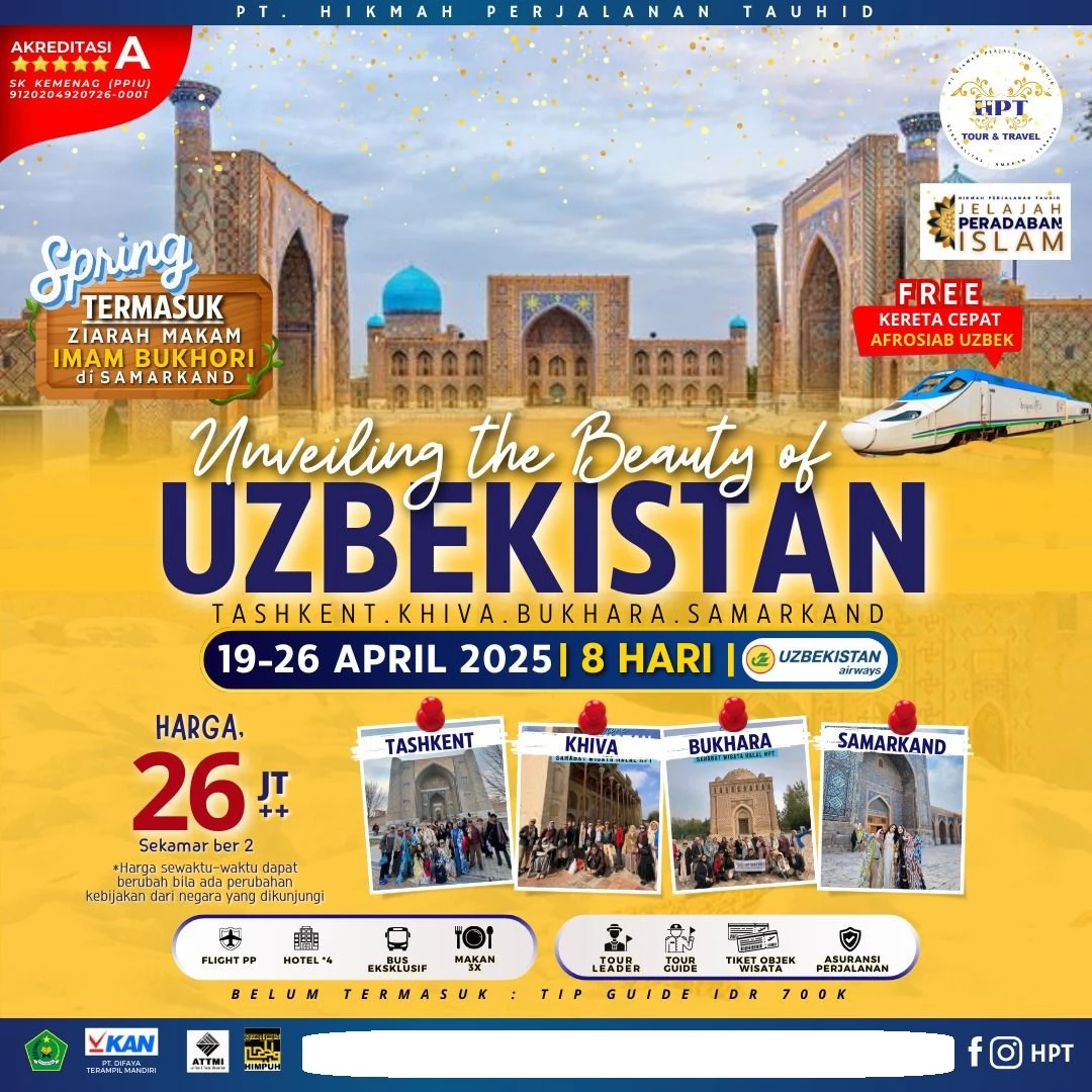 Jangan lewatkan kesempatan untuk mengungkap keindahan Uzbekistan di musim semi pada 19-26 April 2025. Bergabunglah dalam Paket Wisata Halal Uzbekistan yang menawarkan pengalaman istimewa ini dengan harga terbaik dan layanan maksimal. Segera daftarkan diri Anda untuk perjalanan spiritual yang penuh makna dan kenangan indah.