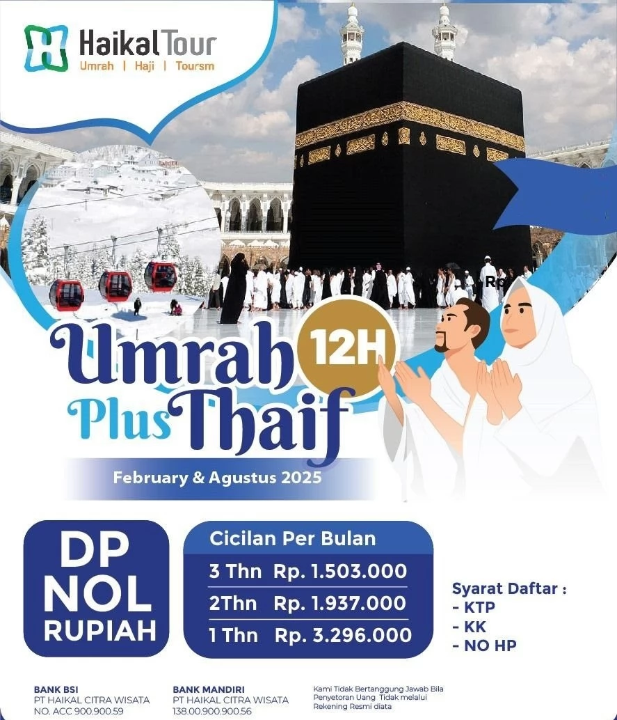 Apakah Anda bermimpi menjalankan ibadah umrah namun terhalang oleh biaya awal yang besar? Kini, Haikal Tour hadir dengan solusi istimewa untuk Anda! Dengan program Promo Umrah DP Nol Rupiah, perjalanan spiritual selama 12 hari plus kunjungan ke Thoif menjadi lebih mudah dan terjangkau.