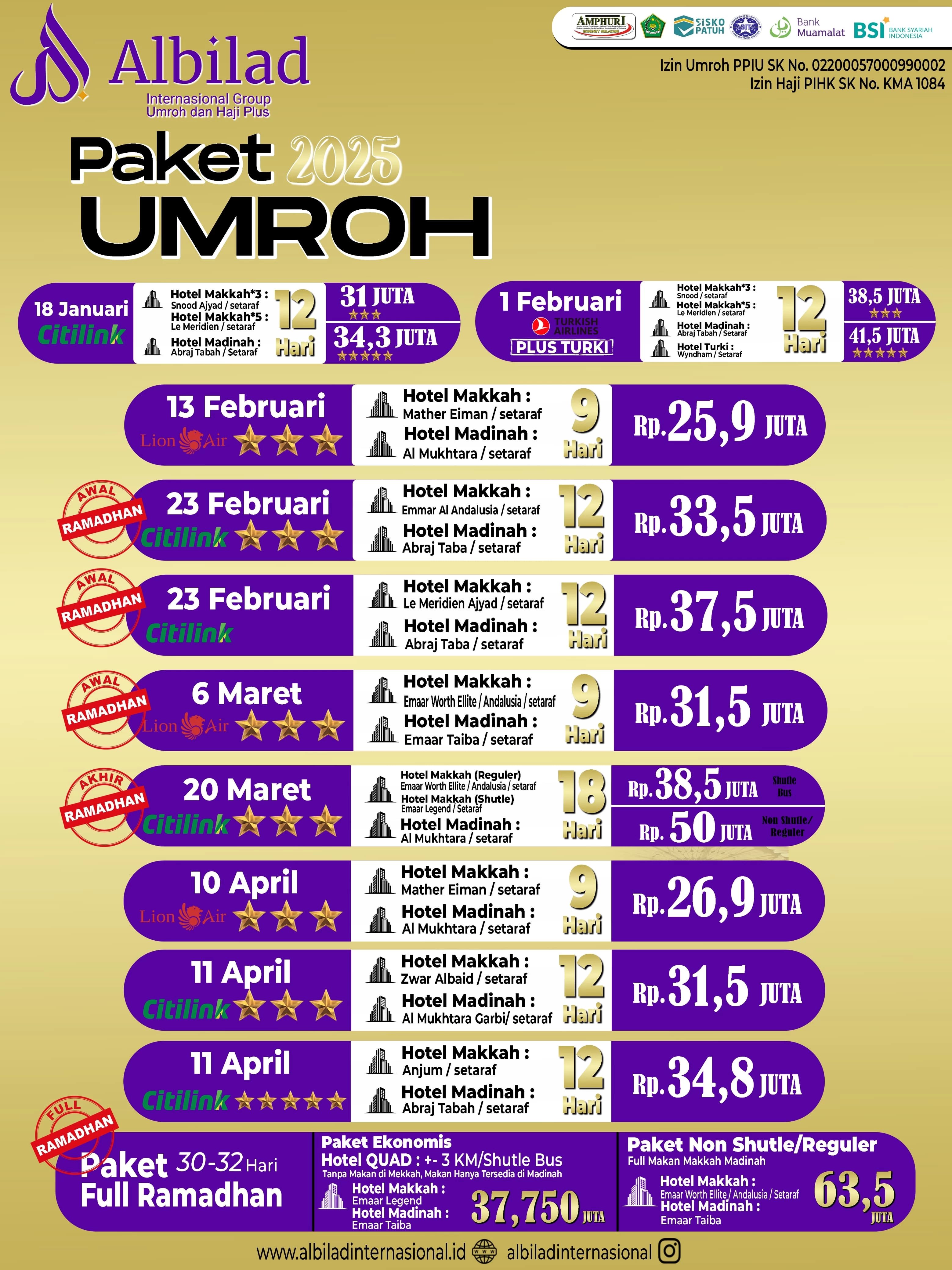 Jangan lewatkan kesempatan untuk melaksanakan Umrah 2025 dengan harga terjangkau mulai 25 jutaan! Travel AlBilad Internasional membuka pendaftaran untuk keberangkatan Umrah di tahun 2025. Tempat terbatas, segera daftarkan diri Anda dan keluarga untuk mendapatkan pengalaman ibadah yang penuh makna di Tanah Suci.