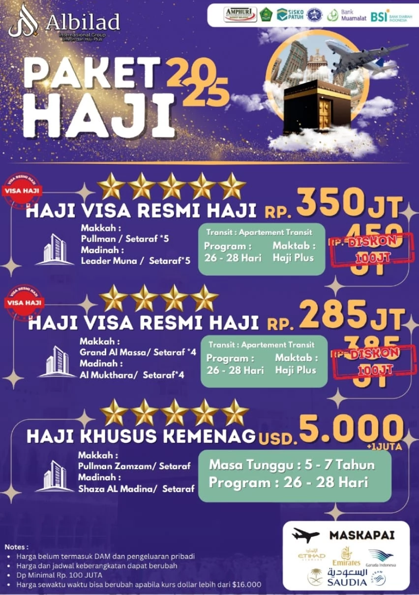 Apakah Anda ingin menjalani ibadah haji dengan kenyamanan maksimal? Jika ya, Paket Haji Visa Haji Resmi 2025 dan Haji Khusus Kuota Kemenag RI adalah pilihan tepat! Dengan fasilitas hotel berbintang 4 dan 5, serta penerbangan menggunakan maskapai ternama seperti Saudia, Garuda Indonesia, atau Emirates, perjalanan haji Anda akan menjadi pengalaman yang tak terlupakan.