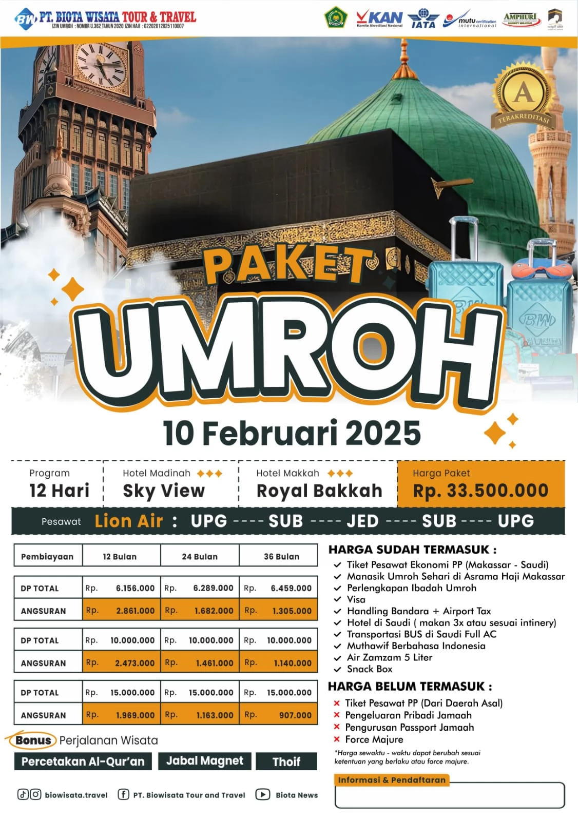Promo Spesial Paket Umrah 12 Hari Start Makassar! Jangan lewatkan kesempatan untuk menunaikan ibadah Umrah dengan berbagai fasilitas istimewa, termasuk Gratis Tour Thoif Jabal Magnet dan Percetakan Al-Quran. Harga terjangkau dan cicilan ringan mulai 900 ribu per bulan. Berangkat Umrah sekarang, cicilannya bisa setelah kepulangan!