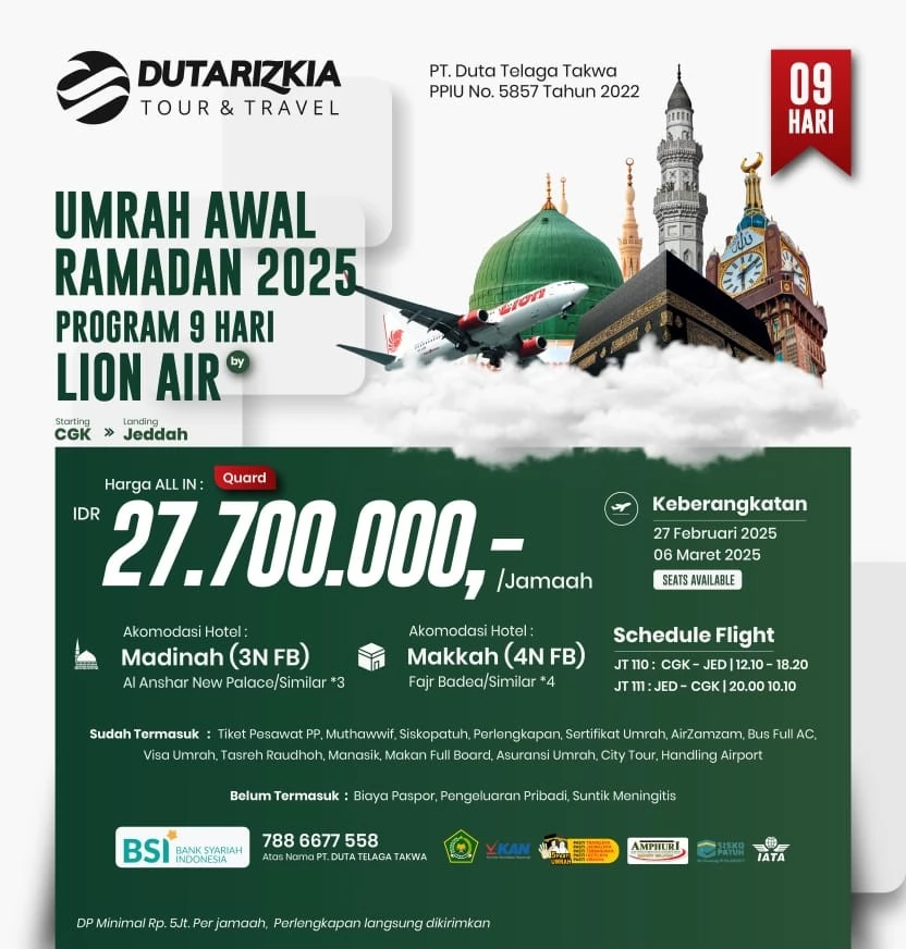 Mencari paket umrah yang ideal untuk memulai Ramadhan dengan penuh keberkahan? Kami punya solusi terbaik! Paket Umrah Awal Ramadhan Program 9 Hari hanya dengan 27 jutaan sudah termasuk perlengkapan lengkap, akomodasi nyaman, dan layanan terbaik!