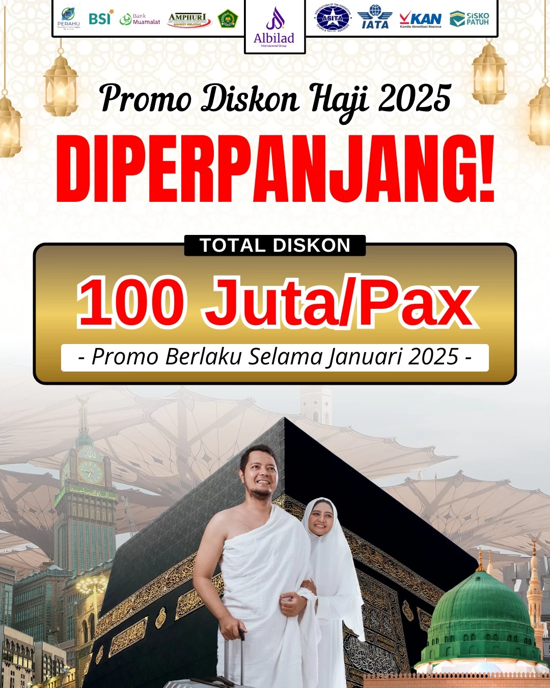 Kabar gembira untuk Anda yang berencana menunaikan ibadah haji di tahun 2025! Promo diskon Paket Haji Visa Resmi 2025 resmi DIPERPANJANG. Kini Anda bisa menikmati total diskon hingga Rp100 juta! Tapi ingat, promo ini hanya berlaku selama bulan Januari 2025 saja. Jadi, jangan sampai terlewatkan!